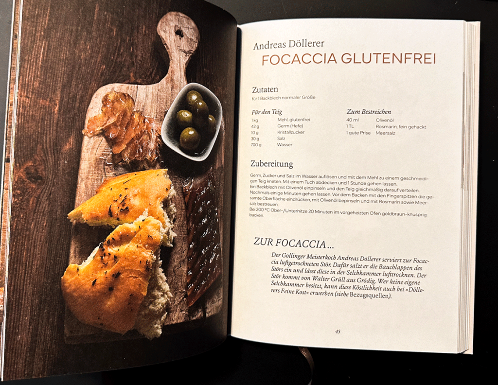 Andreas Döllerer serviert ein „Focaccia glutenfrei“ zu dem er luftgetrockneten Stör empfiehlt. Dafür salzt er die Bauchlappen des Störs ein und lässt diese in der Selchkammer lufttrocknen.