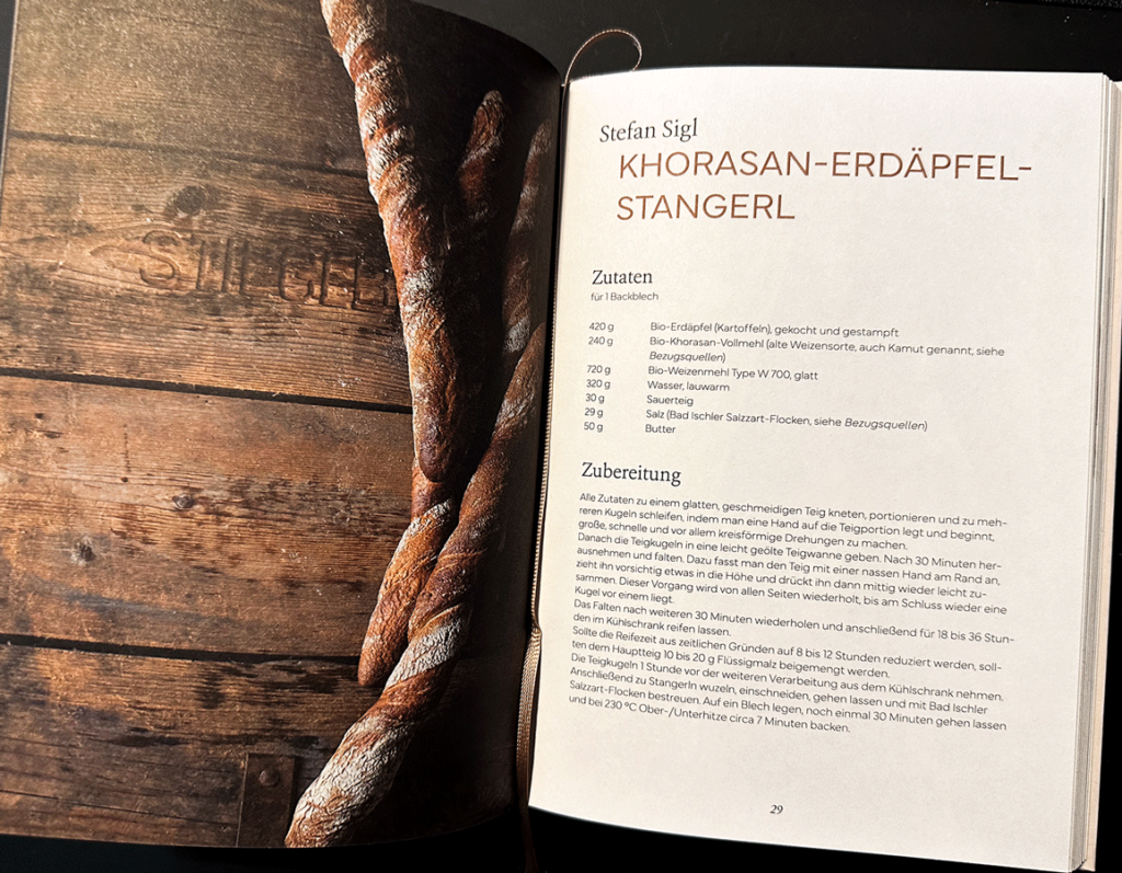 Küchenchef Stefan Sigl stellt seine „Khorasan-Erdäpfel-Stangerl und ein Bio-Speck-Walnussbrot vor.