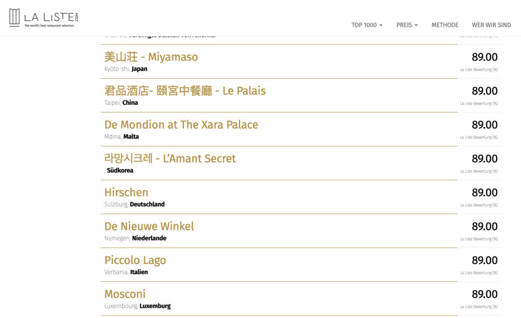 Hier kommt jetzt die Liste der „1000 besten Restaurants“ von La Liste. Taiwanesische Restaurants habe ich hoffentlich alle korrekt bezeichnet! CR