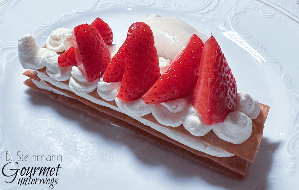 Filoteig, Mascarpone-Creme, Erdbeer-Rosen-Karamell, Mandelsorbet