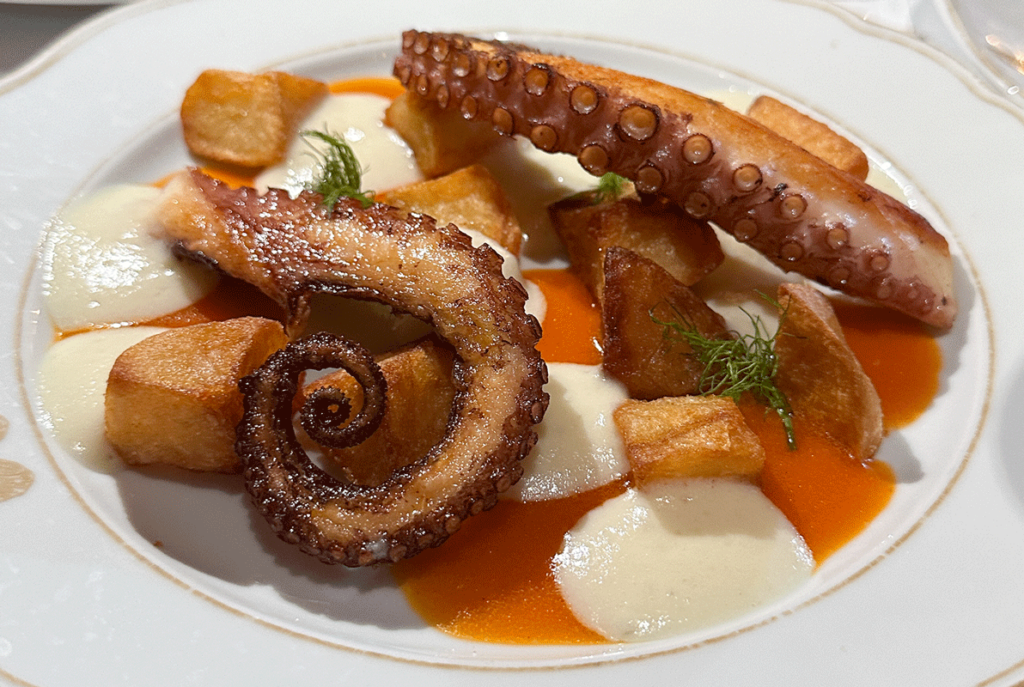 Octopus á la Plancha, Tomatensauce, Fenchelfond, knusprige Kartoffeln