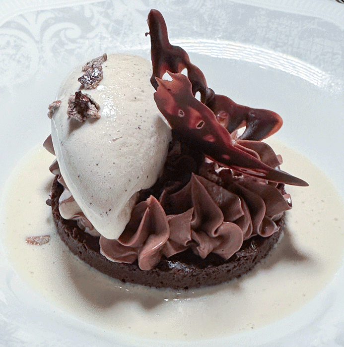 Milchschokoladen-Crémeux, Nussbutter Eis, Tonka-Crème Anglaise