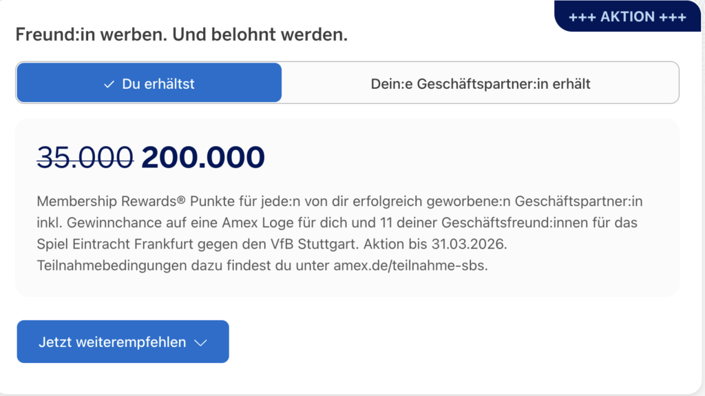 American Express Offers. Dazu müssen Sie sich jeweils freischalten. Dann gibt es mit der Karte einen Cashback. Wenn das passt, ist es gut. Ich habe da – seit ich die Karte habe – um die 150 € gespart, aber das Freischalten ist mühsam und nervig! Also Ersparnis 50 €/Jahr.