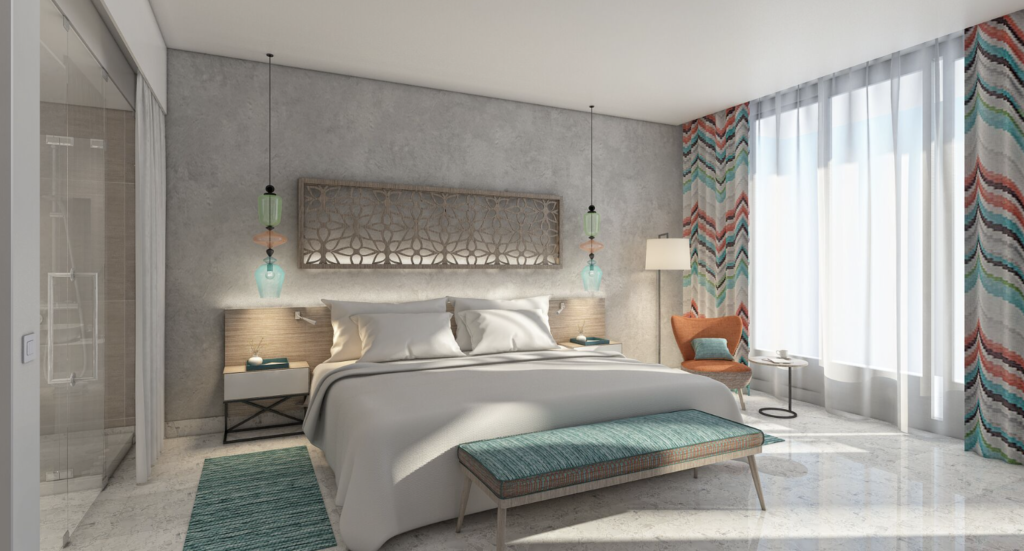 Das von dem renommierten amerikanischen Architektenteam tvsdesign entwickelte Resort greift den traditionellen Stil der Region auf und fügt sich so harmonisch in seine Umgebung ein. Beim Entwurf des Interieurs ließen sich die auf Luxushotellerie spezialisierten Innenarchitekten GG & Grace vom mediterranen Flair inspirieren, das sie mit modernen Designelementen und hellen, warmen Farbtönen gekonnt in Szene setzen.
