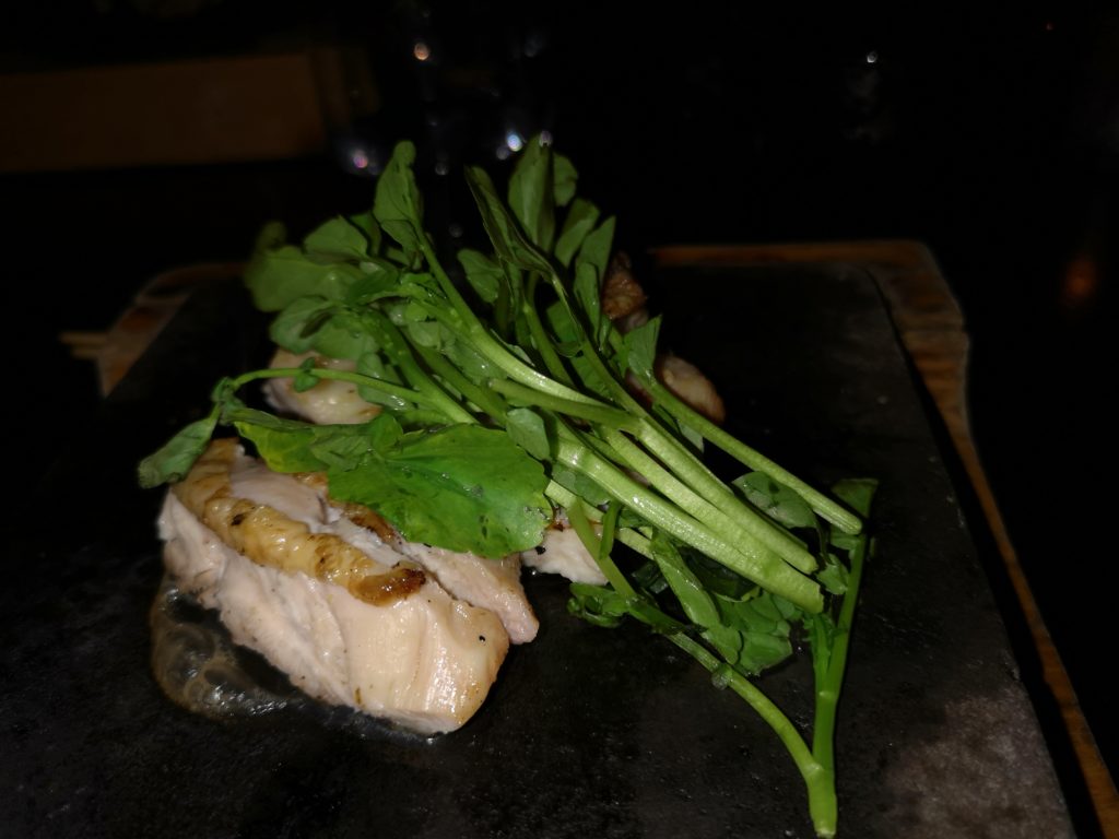 Jetzt kam Bio-Hühnchen auf dem heissen Stein. Der Stein war wirklich sehr heiss und das Hühnchen trocknete prima darauf aus. Neben der unangenehmen Geruchsentwicklung von verbrannten Fleisch war das erneute Töten auf dem heissen Stein wenig sinnvoll. Wer hat solche Ideen? Wenn Grünzeug auf dem Stein fiel, war es auch gleich hinüber 🙁 Wir hatten Hunger und aßen brav auf.