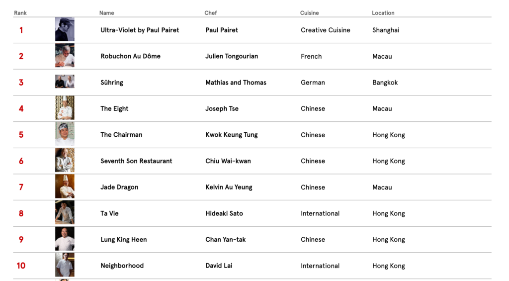 Auf Platz eins steht das Ultra-Violet, das ultra-coole, aber schweineteure Konzept des Franzosen Paul Pairet in Shanghai. Platz zwei belegt Robuchon in Macau und auf Platz vier ist das The Eight aus Macao.