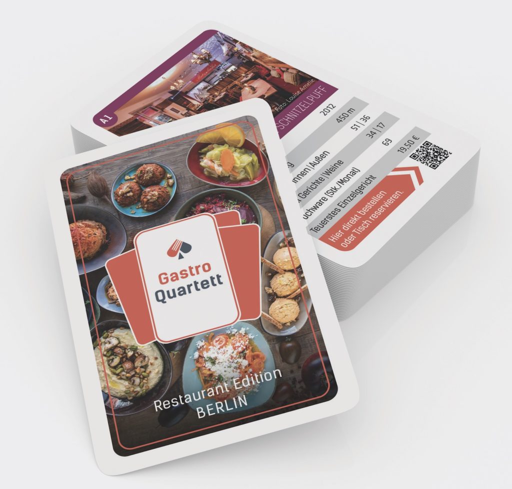 Im Berliner Gastro Quartett kann man mit Außenplätzen punkten oder mit dem teuersten Einzelgericht den Gegenspieler ausstechen, in jedem Fall zeigen sich die Berliner Restaurants als Vergnügen für Zuhause und unterwegs. Dank des passenden QR-Codes kann man das Essen zum Spiele-Abend gleich dazu bestellen oder mit Reservierungen die nahe Zukunft köstlich verplanen.
