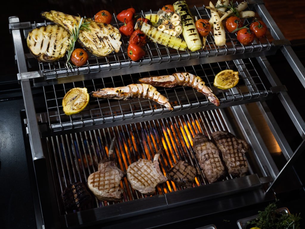 Besonders einzigartig sind die zwei Arten der Grillzubereitung bei Fleisch und Fisch. Zum einen der Lavastein Grill, auf dem beispielsweise die Riesengarnelen gegrillt werden, und zum anderen ein amerikanischer Beefer, der durch kleine Keramik-Pyramiden eine unglaubliche Hitze im inneren Bereich des Grills generiert und das Fleisch einzigartig karamellisiert. Eine extrem heiße Eisen-Platte, die zum Angrillen beispielsweise vom Rib Eye oder Rinderfilet genutzt wird, verleiht den vorletzten Schliff, bevor das Fleisch im inneren Bereich des Grills fertig gegrillt wird.