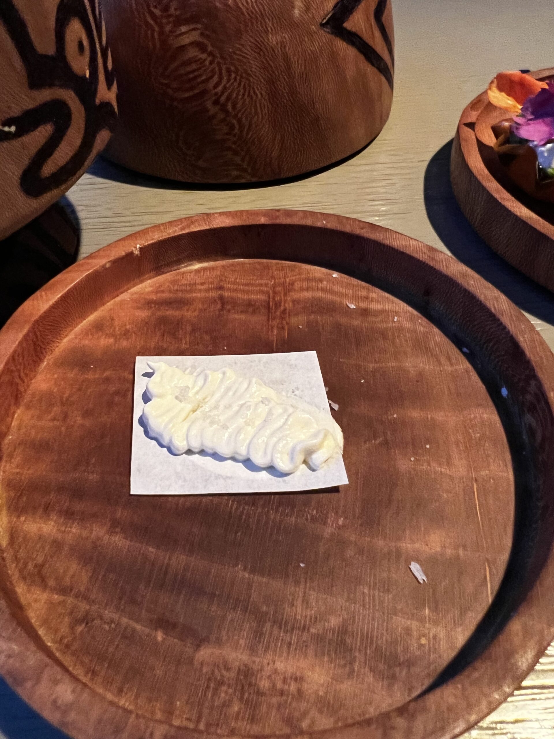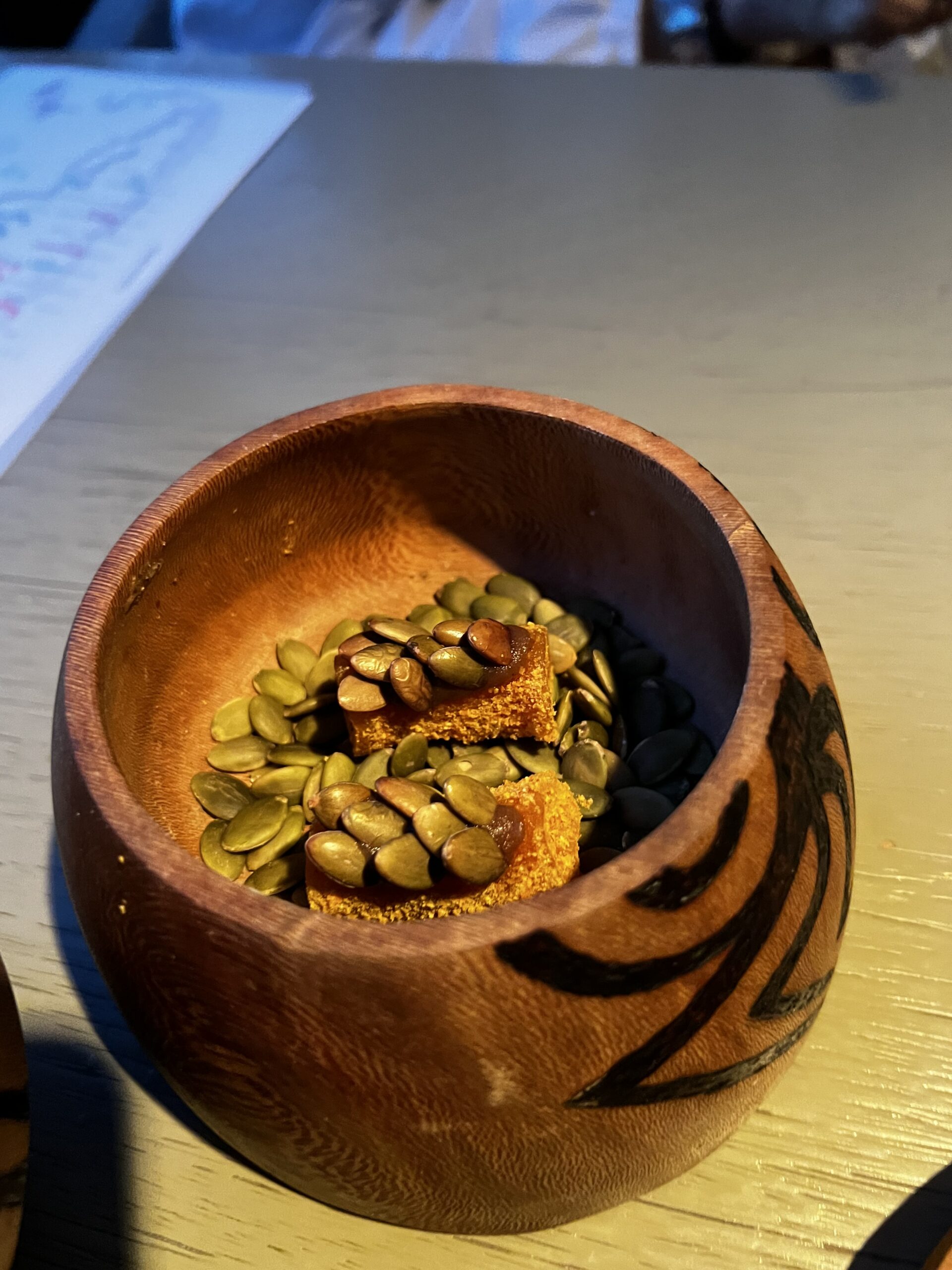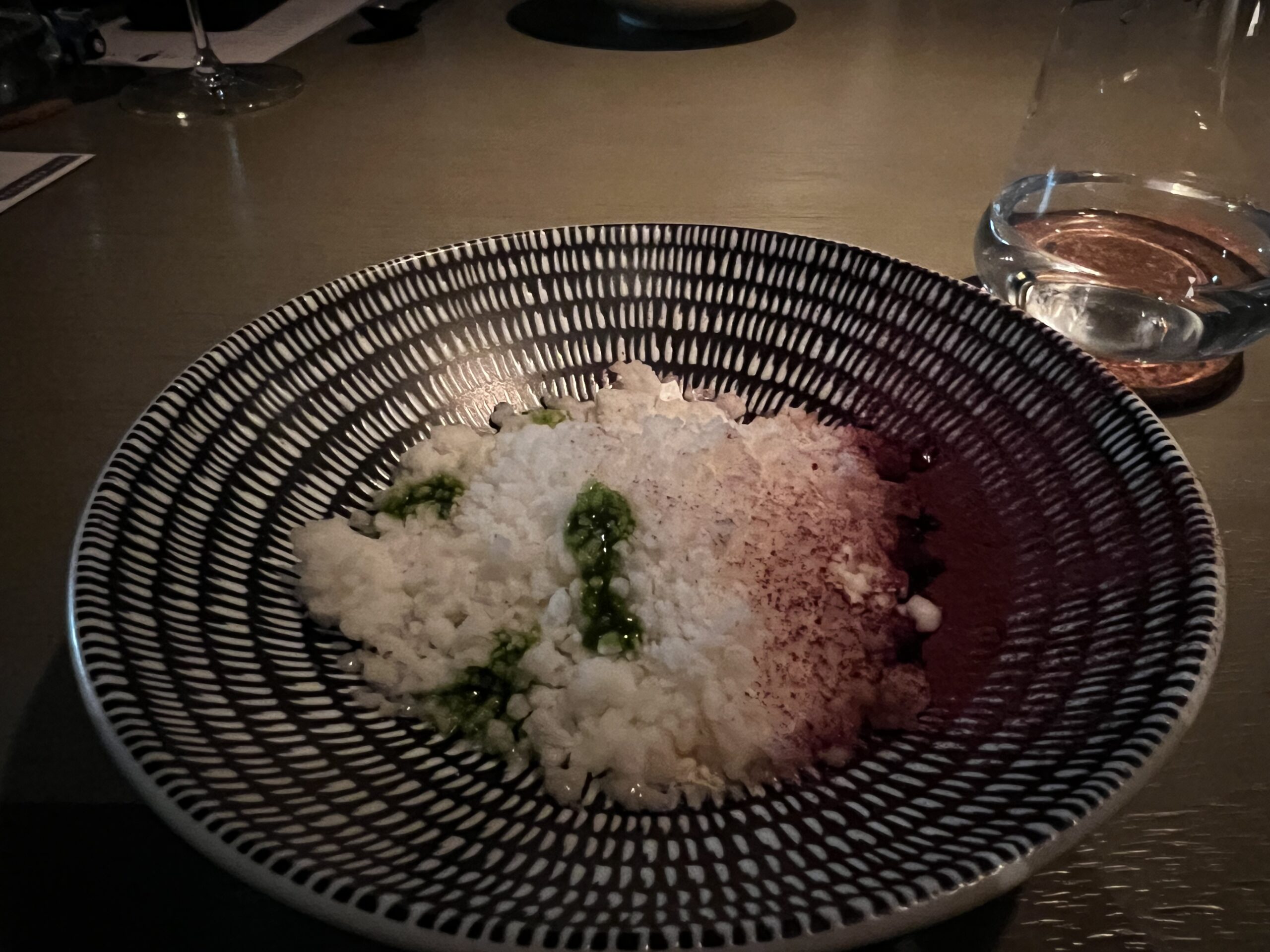 ? Fragezeichen war ein merkwürdiges Gericht. Wir sollten erraten, was es ist. Wir schmeckten Rettich, Rote Bete und Kartoffeln und bewiesen unser kulinarisches Hauptschulniveau. Es war fermentierte Karotte mit Tralala Mayonnaise und anderem, was ich weder auf Spanischem Englisch verstand, noch schmeckte. Es schmeckte aber pappig und nicht so, das wir uns ein Zweites wünschten, wie bei manch anderem Gang.