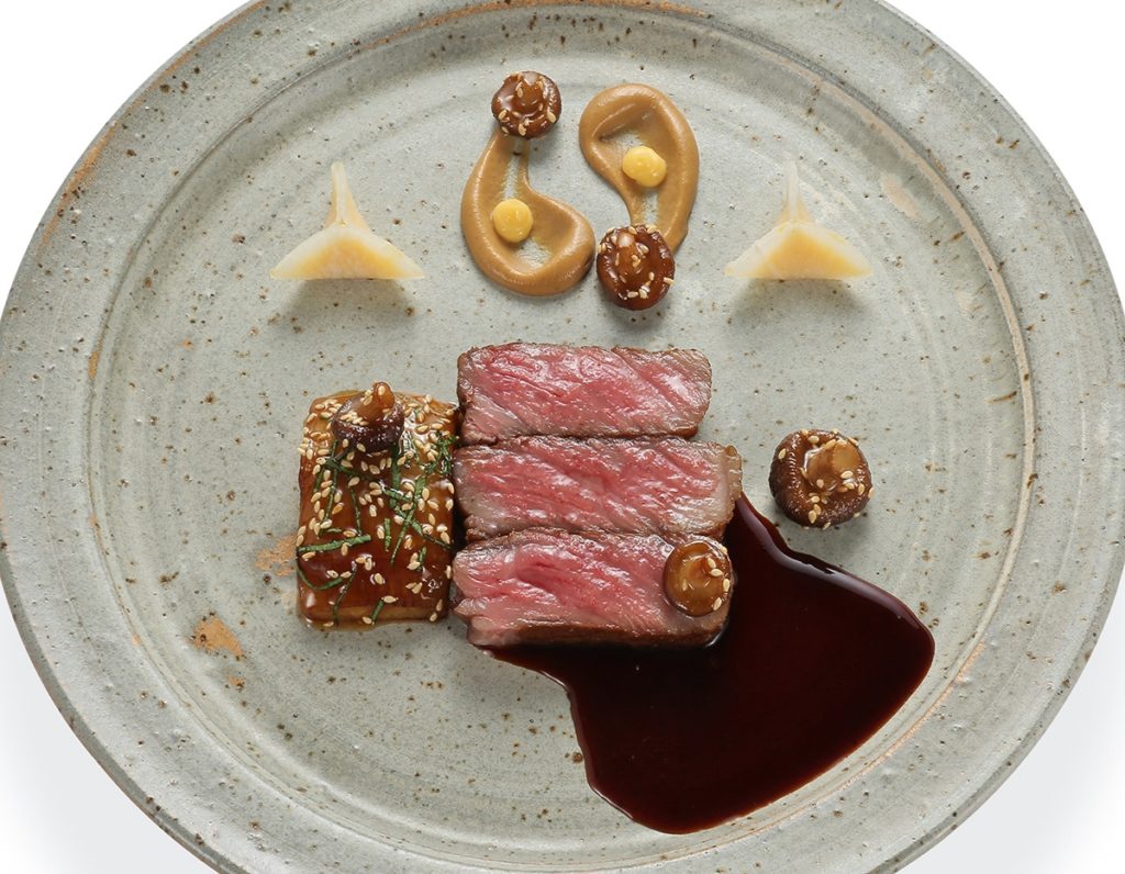 Fertigstellung: Die Pfifferlingcreme auf den Teller spritzen, mit einem Kaffeelöffel zwei Tränen ziehen und zwei Punkte Kimizu hineinspritzen. Rettichravioli mit Aubergine und Mini-Shiitake daneben platzieren. Die Rindersteaks in gleichgroße Stücke schneiden und dazu anrichten. Die Rinderjus aufkochen und angießen.