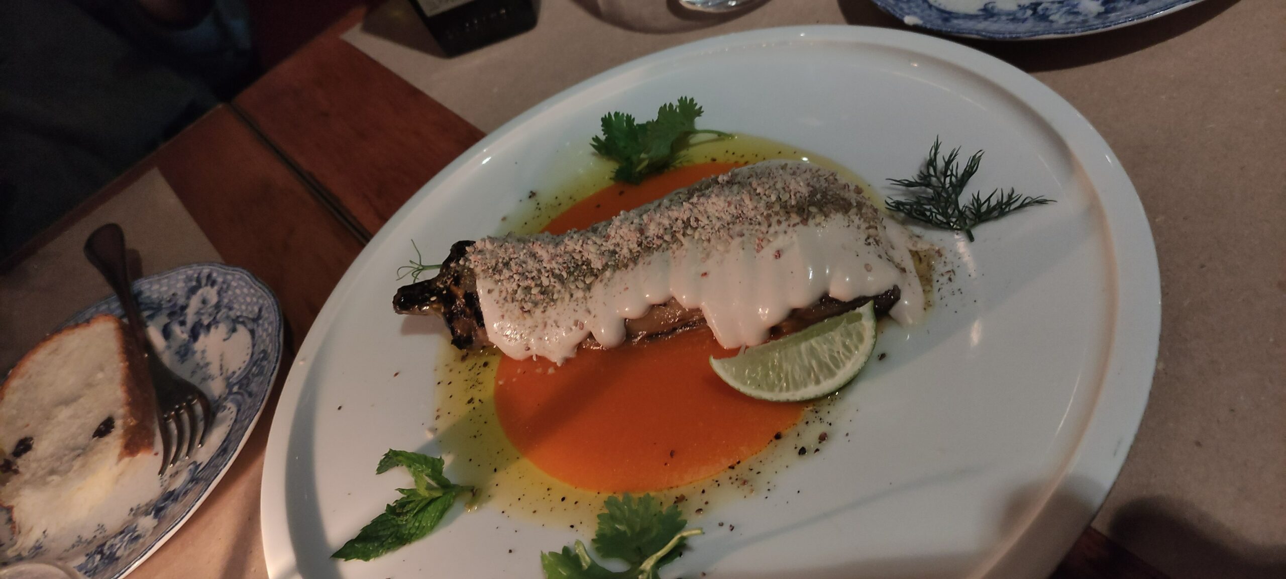 Wir wählten das Mishiguene. Eine jüdische Immigrantenküche. Platz 29 der 50 Best in Lateinamerika. Ein sehr quirliges Restaurant. Wir wurden draussen platziert. Man sitzt bei sehr lauter Musik, einer Mischung aus Klezmer, Free Jazz und Balkan Brass unter einer Markise, die uns vor dem Regen, aber nicht den staubigen Windböen schützte. Direkt nebenan tobt der Verkehr auf einer 4-spurigen Strasse. Mein kleiner Sohn war begeistert, die Müllabfuhr, die Busse und die vielen tatütatas zu beobachten. Das große Zehngang-Menü, was wir eigentlich nehmen wollten, muss man vorbestellen. Das 6 Gang Menü war unspannend, also wählten wir aus der Karte. Der sympathische, englischsprechende Maitre stoppte mich. Vier Gerichte würden reichen. Dazu Wasser und 1 Glas Wein bestellt. Sonst sprach niemand englisch und die Kommunikation war schwer. Internet war defekt.