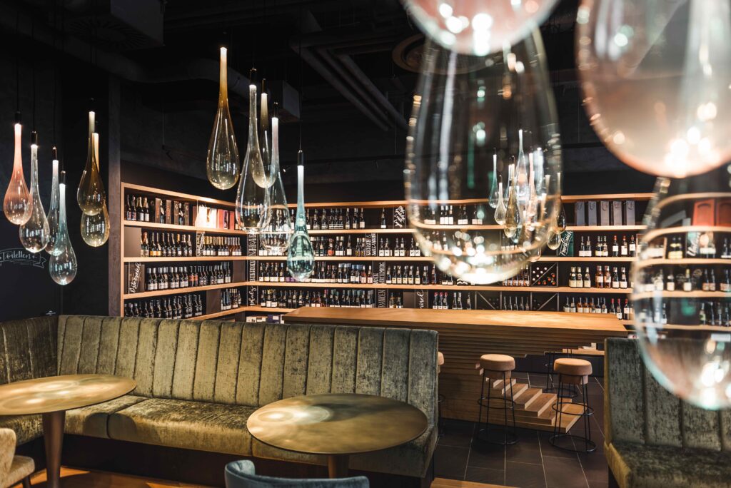 Das Restaurant im cosy Lounge-Style sowie die eindrucksvolle Bar, die auch das Herzstück der Weinbar ist, verbinden auf lässige Weise Weinkultur mit zeitgemäßem Design. Das Raumkonzept mit Wohlfühlatmosphäre hat Julia Bornefeld entworfen. Ein bemerkenswertes Highlight ist darin die zentrale Genuss-Insel mit Sesseln, kleinen Tischen und einer gepolsterten Bank, die den Raum umschließt. Die warme Farbgebung unterstreicht das besondere Flair. Für die perfekte Lichtstimmung sorgen die Design-Lampen Light4, die Bornefeld aus Italien bezogen hat. Dank der offenen Regale und gläsernen Kühlschränke spielt der Wein auch im Raum eine wichtige Rolle, ohne sich in den Vordergrund zu drängen.