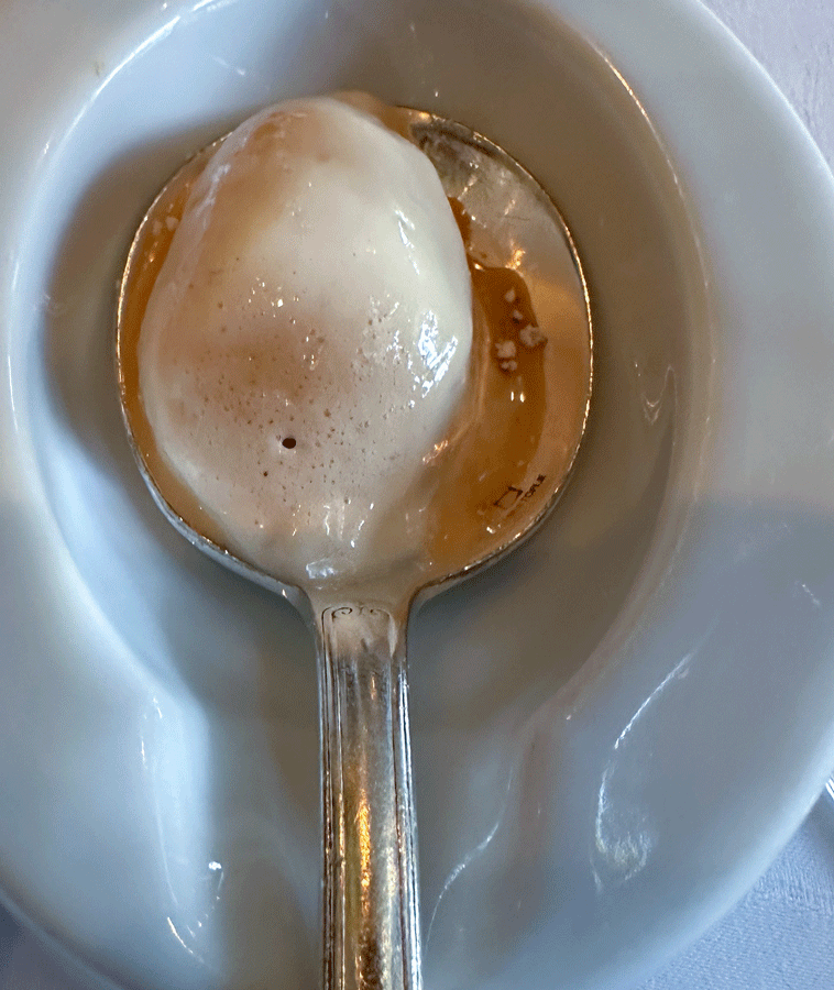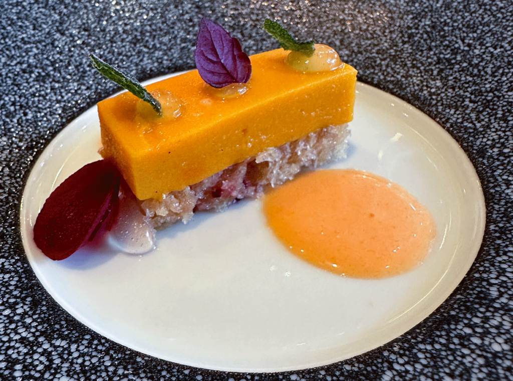 Die Präsentation habe ich dabei etwas länger auf mich einwirken lassen. Sie entspricht auf erstaunliche Weise der Aussage von Küchenchef Claus-Peter Lumpp im Interview: „Wir entwickeln unsere Gerichte nach dem Geschmack, und danach die Präsentation. Und nicht anders herum.“ (https://www.bsteinmann-gourmet-unterwegs.de/archiv-der-kulinarik/).