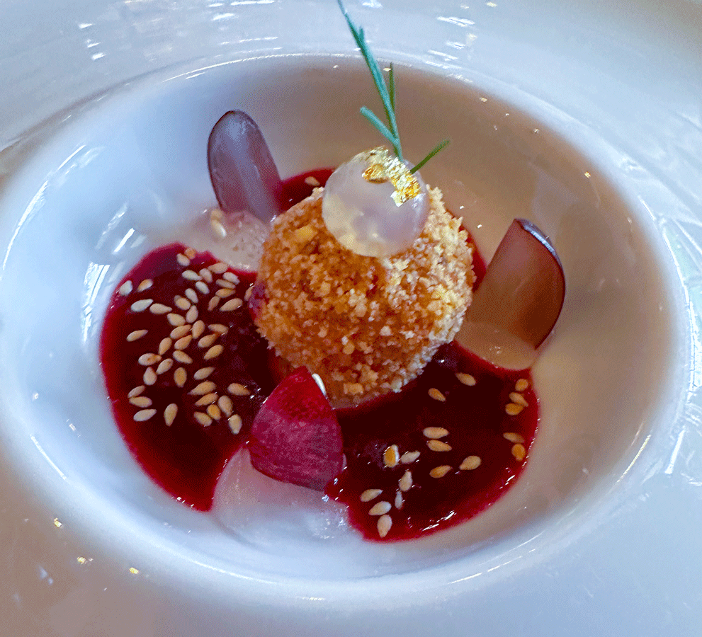 Gänseleberpraline mit Sesam, gebratene Gänseleber mit Calvados Apfel