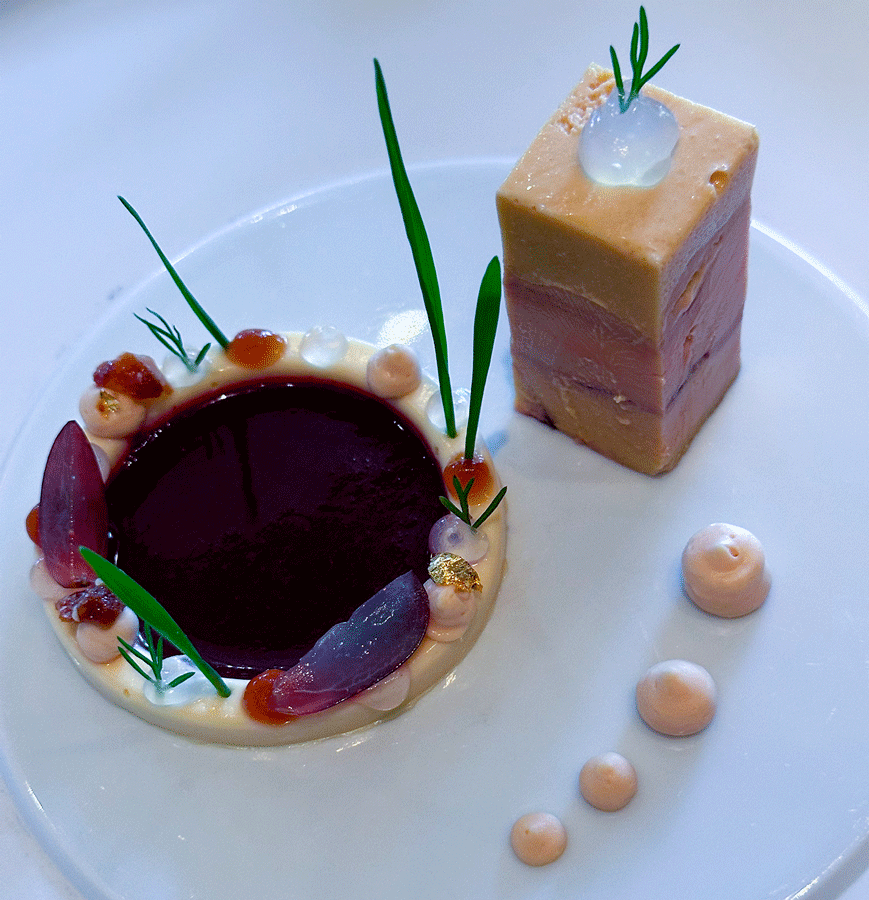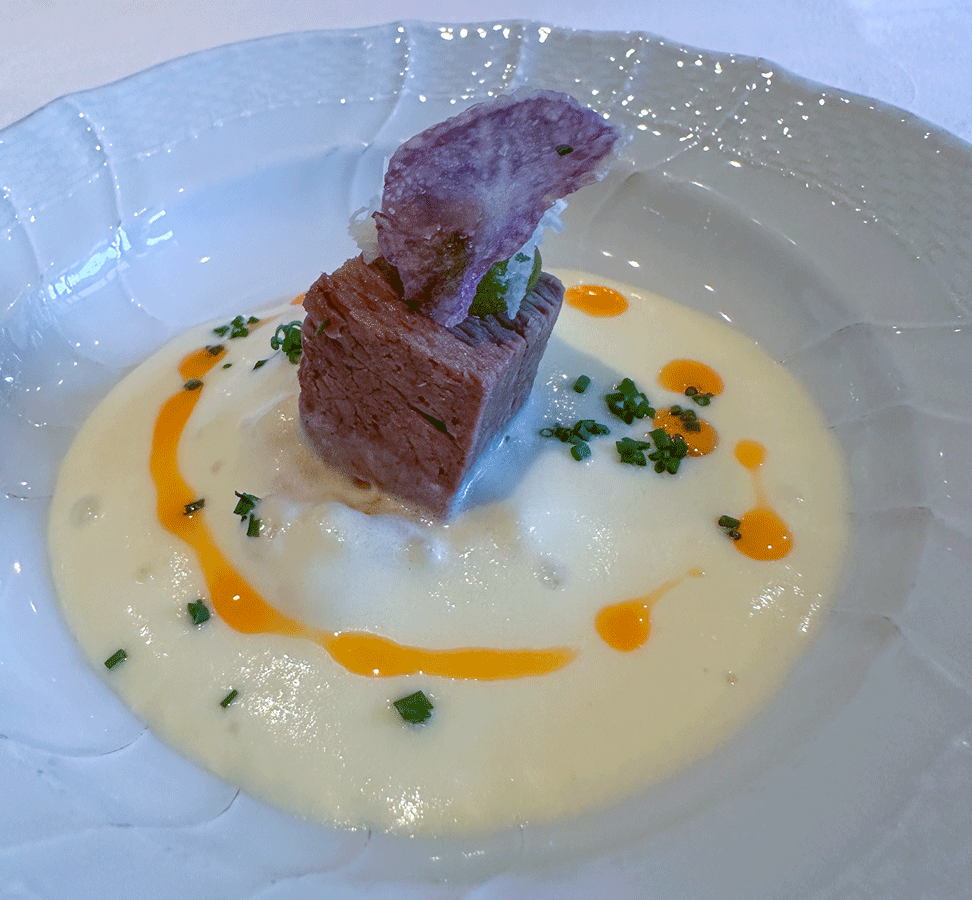 Die Sparsamkeit der Präsentation lässt keinen Aufschluss auf die geschmackliche Dimension erkennen. Beim Genuss der Terrine wird sofort deren Subtilität erkennbar. Man möchte die Augen schließen und leise vor Vergnügen seufzen. Dabei ist dies erst der Start des Vergnügens. Die weiteren Teile des Gerichts halten spielend das hohe Niveau, wobei die gebratene Gänseleber, für meinen Geschmack, noch herausragt.