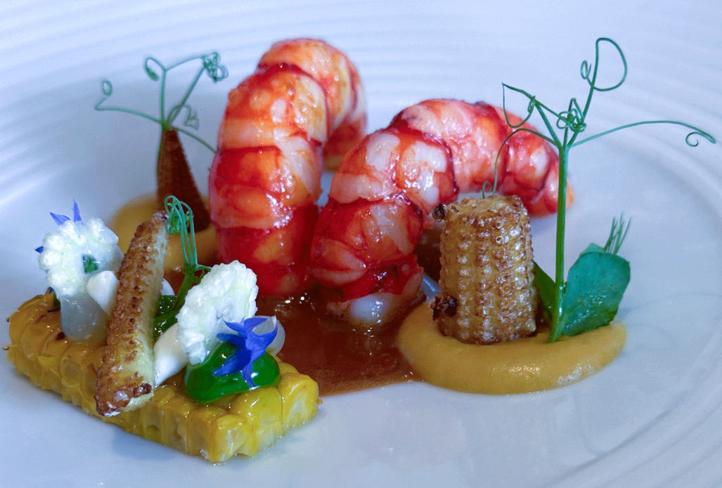 Gamba Carabiniero mit geräucherter Maiscreme, Sauerrahm und Limette