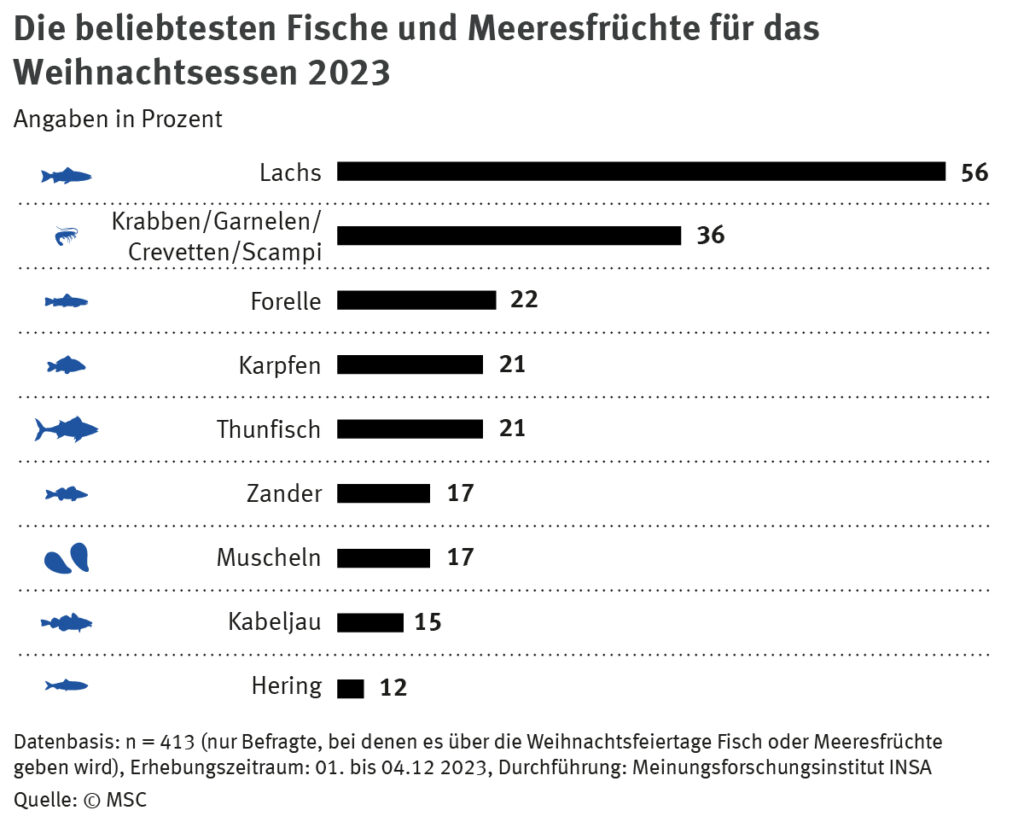 [2]. Datenbasis: n = 413 (nur Befragte, die über die Weihnachtsfeiertage Fisch oder Meeresfrüchte essen werden), Erhebungszeitraum: 01. bis 04.12 2023, Durchführung: Meinungsforschungsinstitut INSA-Consulere