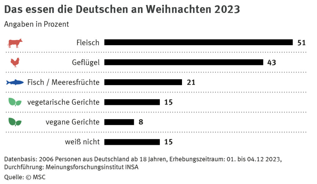 Was essen die Deutschen an Weihnachten 2023? 51 % Fleisch, 43 % Geflügel, 21 % Fisch / Meerestiere, 15 % vegetarisch und 8 % vegan