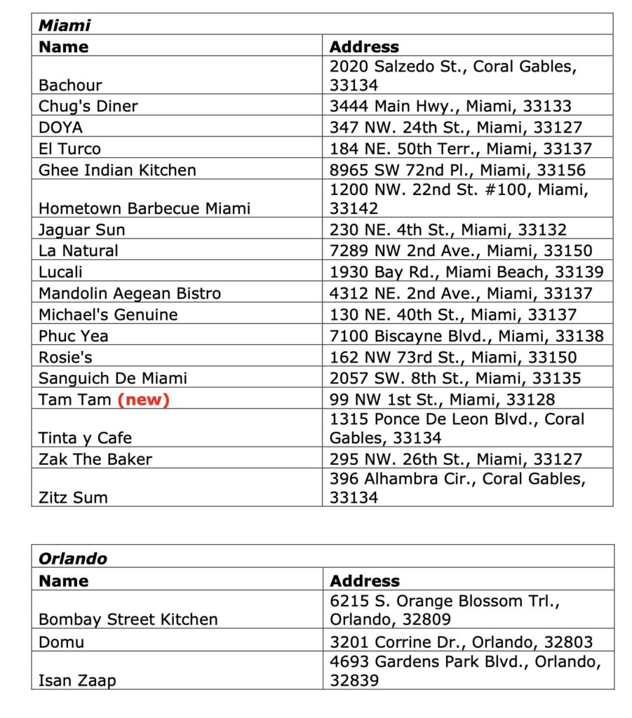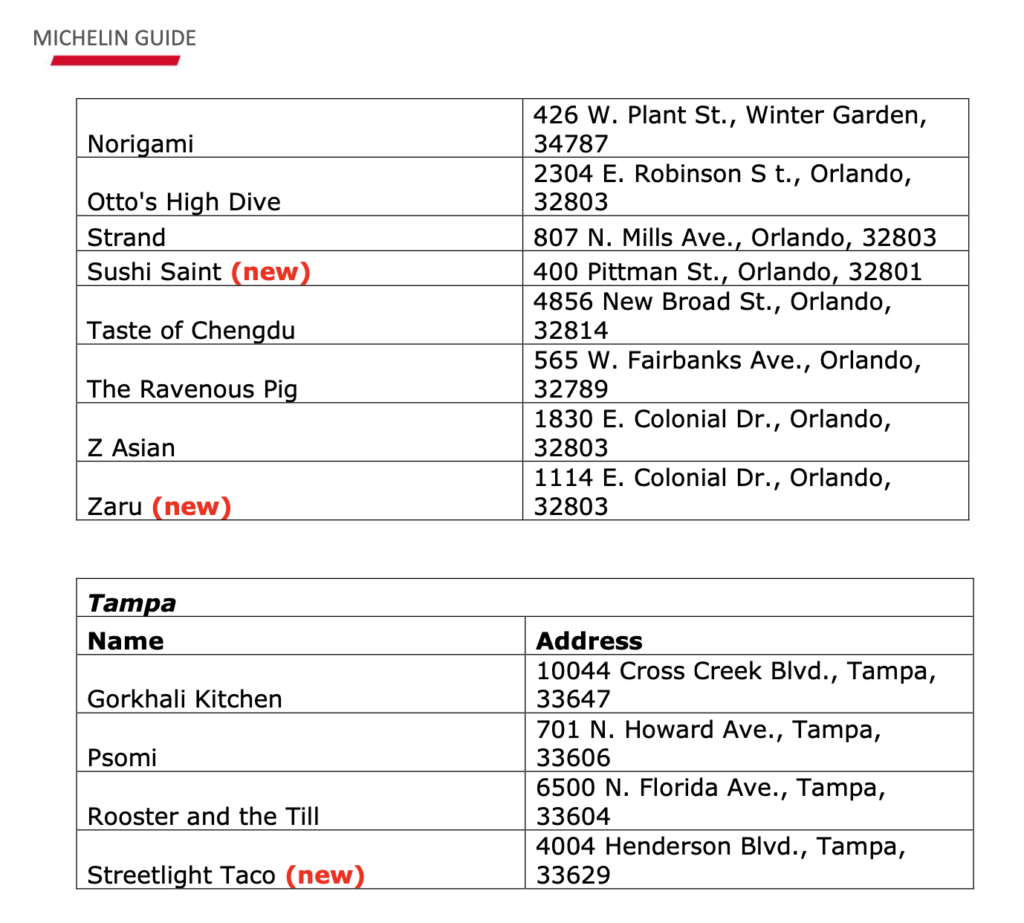 Das ist für Touristen eine besonders interessante Auswahl, da es sehr schwer ist in den USA gut & günstig zu essen! Die Inspektoren des MICHELIN-Führers haben 33 Restaurants gefunden, die die Auszeichnung „Bib Gourmand“ verdient haben, die für gutes Essen zu einem guten Preis vergeben wird. Dies sind Restaurants, in denen man zwei Gänge und ein Glas Wein oder ein Dessert für etwa 50 Dollar bekommt. In der Region Miami waren es 18, in der Region Orlando 11 und in der Region Tampa vier.