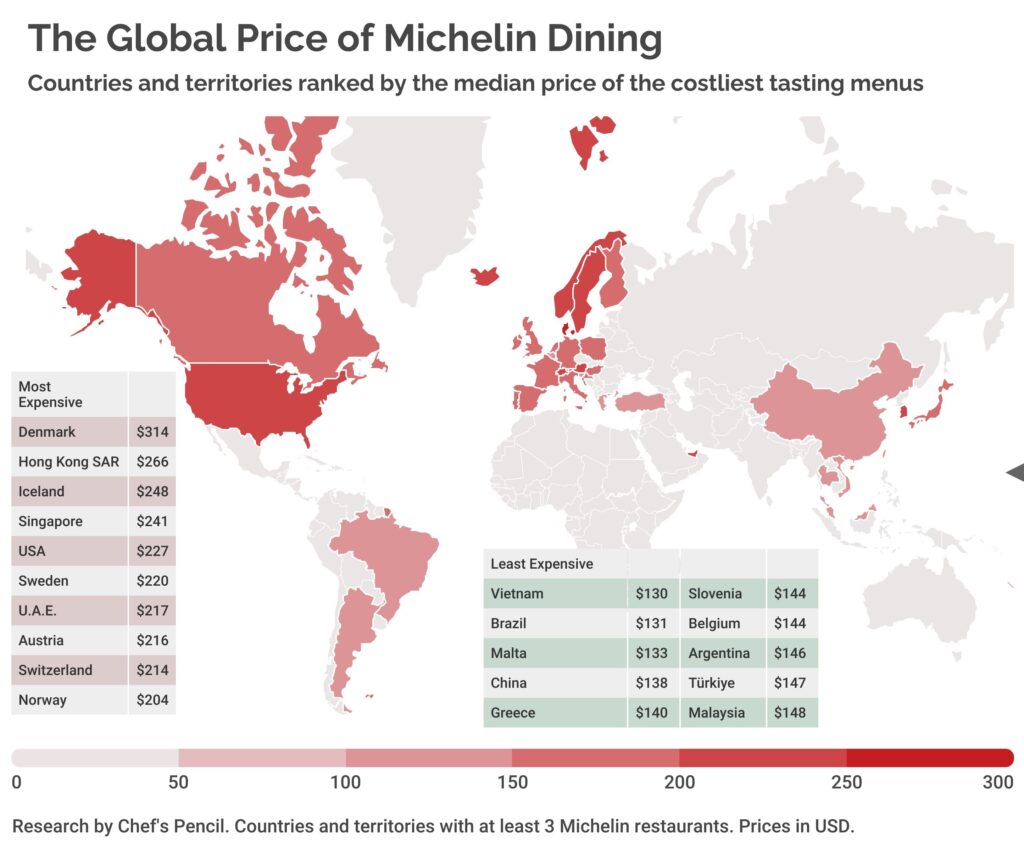 Die Kosten für das teuerste Degustationsmenü liegen im globalen Median bei 179 USD (167 €) pro Person, ohne Getränke, staatliche Abgaben und Trinkgeld. Darüber hinaus erhöht jeder weitere Stern den Preis um 100 USD, wobei Restaurants mit einem Stern im Durchschnitt 165 USD, mit zwei Sternen 256 USD und mit drei Sternen 356 USD kosten.