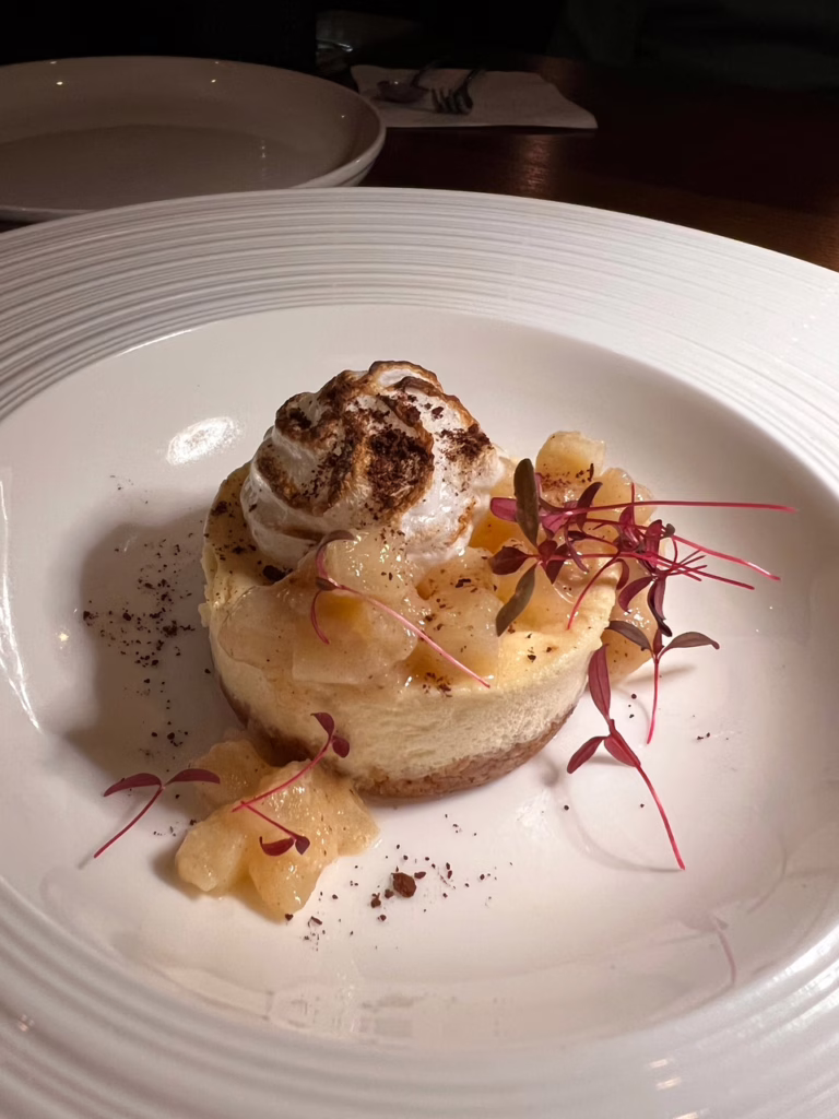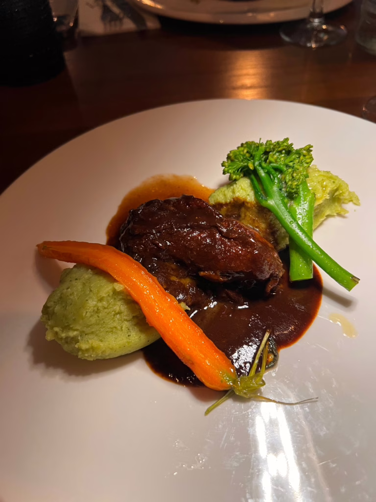 Es startete mit einer Pastinakensuppe mit Chorizo, die mir sehr gut schmeckte. Im Hintergrund der Martini Cocktail, den es on Top gab. Die Ochsenbäckchen mit der tollen Sauce begeisterten uns vier, während der Cheesecake mich nicht begeisterte – zu süss, ich mag ihn klitschiger – aber alle anderen.