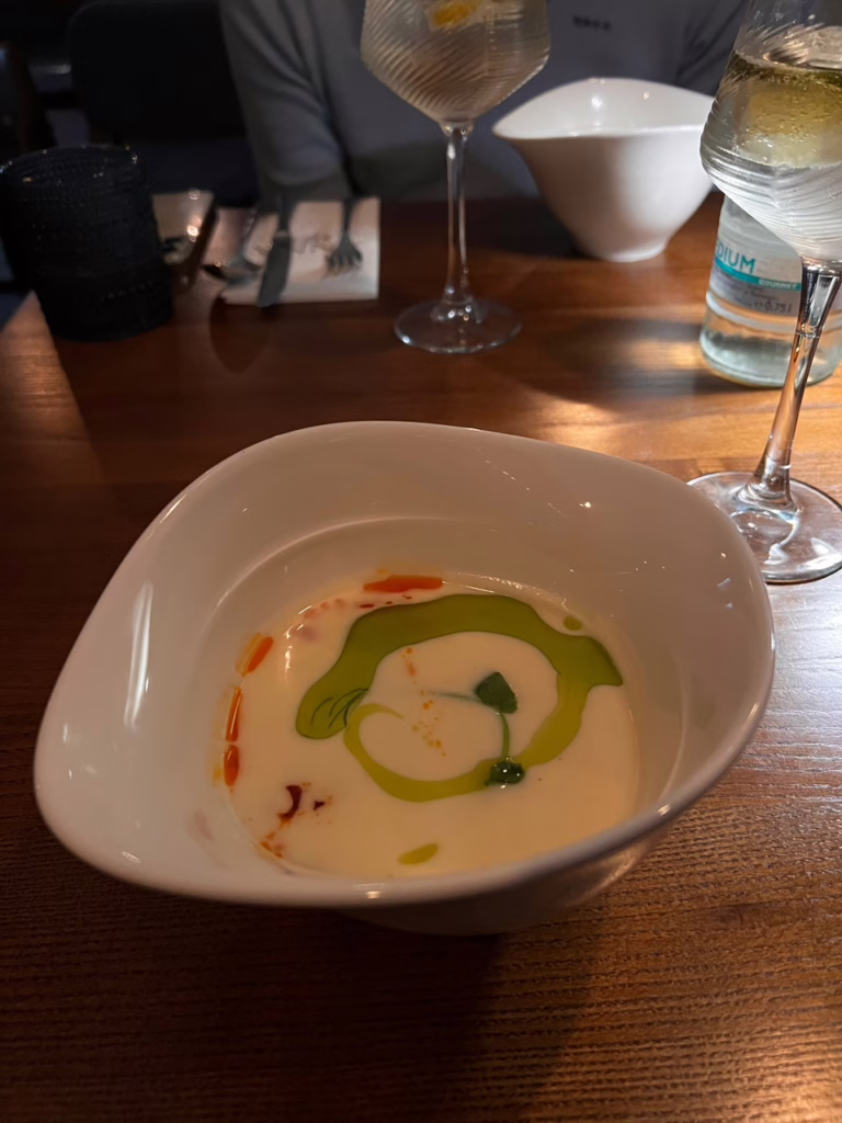 Wir bekamen eine Burata mit Radicchio und einen Weißwein, der angenehm war. Anschliessend gab es ein getrüffeltes Selleriesüppchen, das ziemlich gut war und ich bin kein großer Suppenfan. dafür gefiel mir der Grüne Veltliner nicht so gut wie der erste Wein, ein Chardonnay.