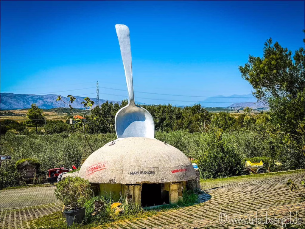 Gründer Altin Prenga gilt als Pionier der albanischen Slow-Food-Bewegung. In seinem Farm-to-Table-Betrieb stammen die meisten Zutaten wie Käse, Fleisch, Marmeladen, Wein und Gemüse direkt vom eigenen Hof oder aus einem Netzwerk von mehr als 400 Familien aus der Region. Hier lebt man das Motto „Think Globally, Eat Locally“ und übernimmt zugleich soziale Verantwortung durch die Förderung der lokalen Landwirtschaft und die Bewahrung kulinarischer Traditionen. Insgesamt ist Mrizi i Zanave ein sehr familienfreundlicher Ort, der neben kulinarischem Genuss auch zahlreiche Aktivitäten bietet: Kinderspielplatz, geführte Farmbesichtigungen, Musik- und kulinarische Events, Tagesausflüge und vielfältige Outdoor-Erlebnisse. Auf dem Gelände erinnern mehrere Bunker aus der Zeit Enver Hoxhas an Albaniens Vergangenheit. Gleich an der Einfahrt stößt man auf ein besonders markantes Bild: Ein alter Bunker, aus dem ein überdimensionaler Esslöffel ragt.