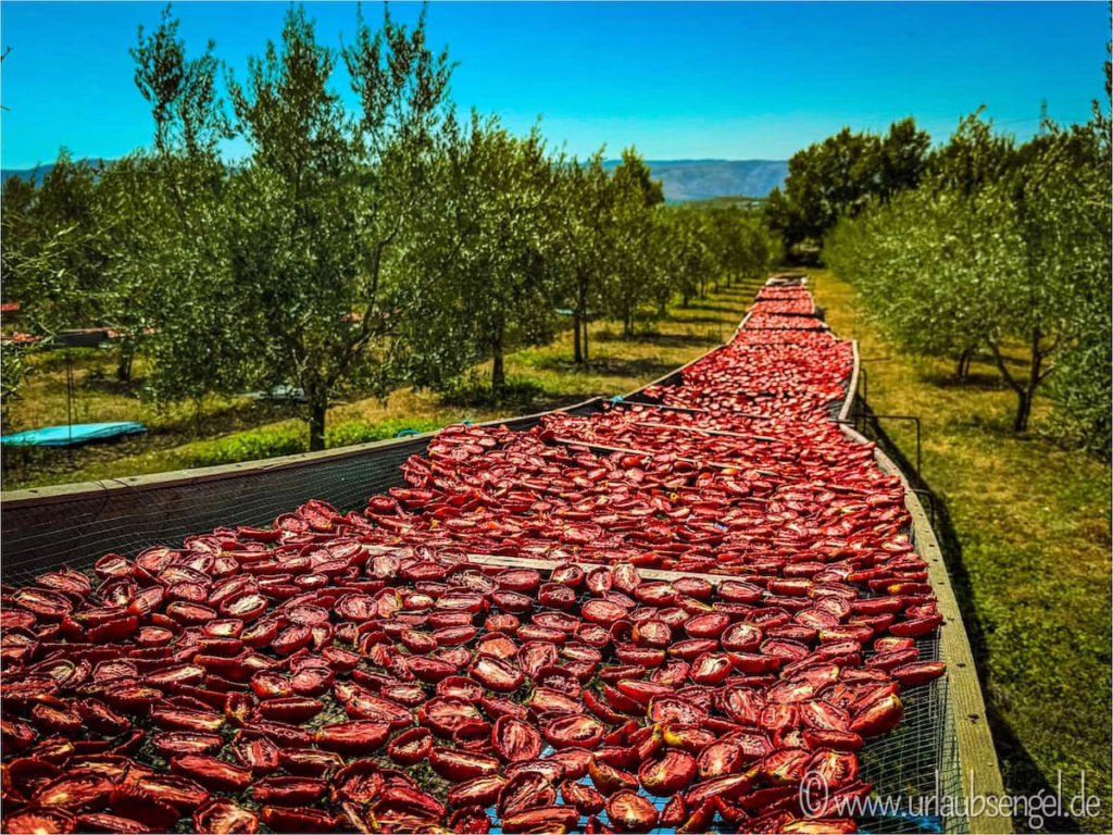 Der Hof produziert eine beeindruckende Vielfalt an regionalen Lebensmitteln: Käse aus der eigenen Käserei, hausgemachte Wurstwaren, Schinken, Marmeladen, Weine aus Rebsorten wie Kallmet und Shesh, sowie hochwertiges Olivenöl. Auf den Feldern gedeihen saisonale Gemüsesorten – Tomaten, Gurken, Okraschoten, Kräuter, Reis und Oliven – die frisch verarbeitet oder haltbar gemacht werden. Außerdem werden Ziegen, Gänse und Hühner gehalten. Viele Produktionsschritte, von der Mühle bis zur Räucherei, finden direkt vor Ort statt und stärken so die regionale Wertschöpfung. Die Produkte werden im hofeigenen Shop zum Kauf angeboten.