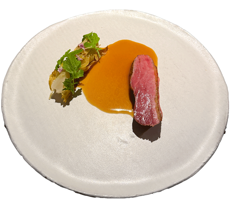Eine lange reduzierte und leicht scharf abgeschmeckte Entenjus ergänzte das Fleisch hervorragend. Der Spitzkohl wurde im Ofen verbrannt woraufhin die großen Blätter entfernt wurden. Unter der Beigabe von Salzzitrone, Senfkraut und Stachelbeere hatte das Gericht aromatisch viel zu bieten. Von Schärfenoten bis zu süßen Aromen war alles drin. Eine großartige Kreation.