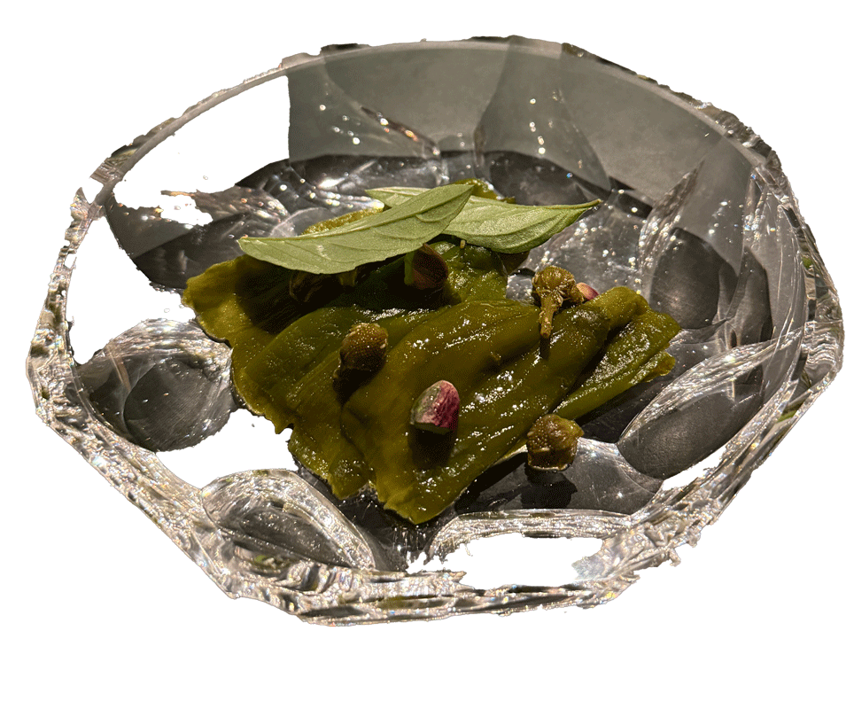 Eine Creme auf Mayonnaisebasis, mit Verjus abgeschmeckt, war recht schmackhaft. Obenauf befand sich wildes Basilikum. Vollendet wurde die Kreation mit Pistazienkernen und einer sauer eingelegten Kamillenblüte.