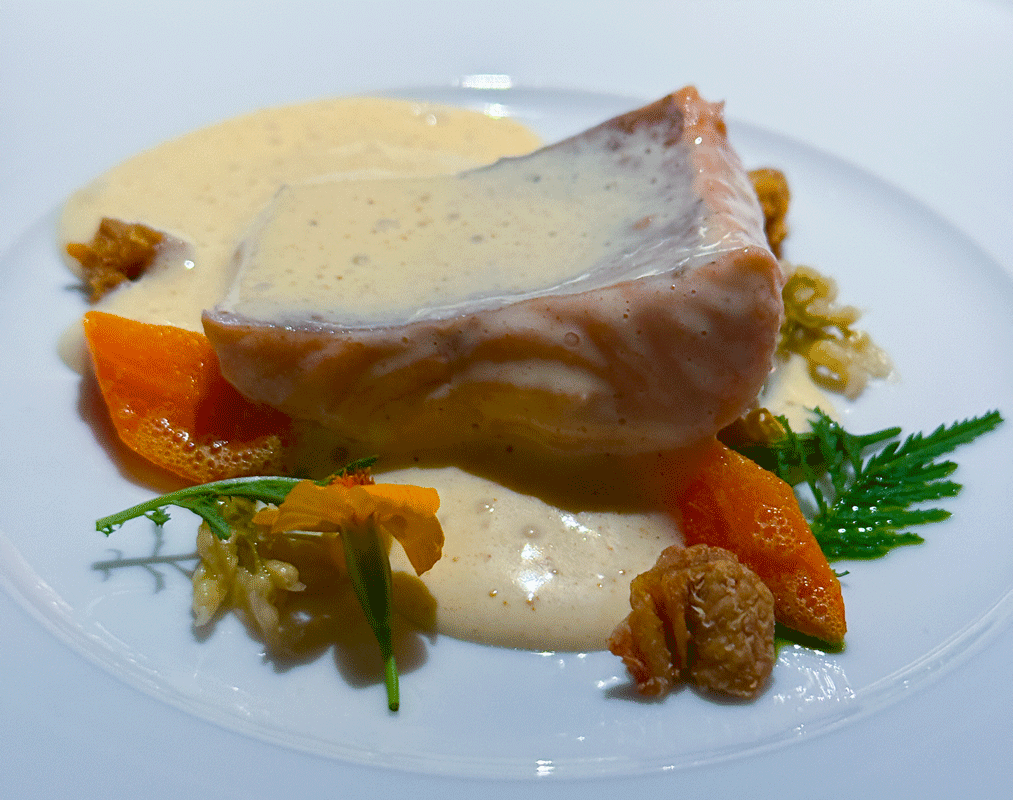 Der Saibling aus der Müritz wurde gedämpft, mit krosser Hühnerhaut dekoriert und mit einer Sauce aus brauner Butter und Wagyusud versehen. Dazu Bärlauchöl und Karotte.