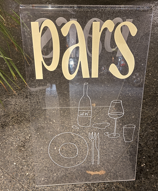 An den Wänden hängen die Ergebnisse kreativer Prozesse, die ich hier nicht näher beschreiben möchte. Das Mobiliar besteht aus einfachen Tischen und vor allem aus Holzstühlen, auf denen ich eigentlich in einem Restaurant der gehobenen Gastronomie nicht mehr Platz nehmen möchte. Berliner mögen dies als gemütlich bezeichnen, ich bin da eher bei unbequem.
