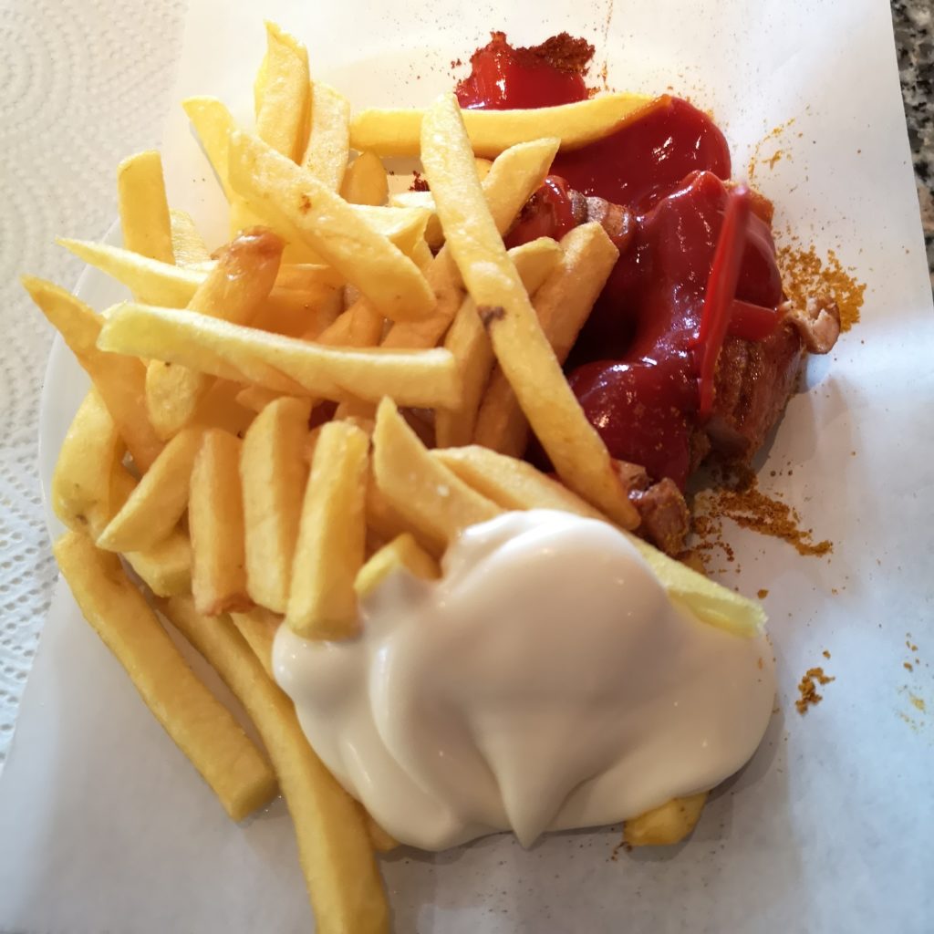 Currywurst mit Pommes rot weiß