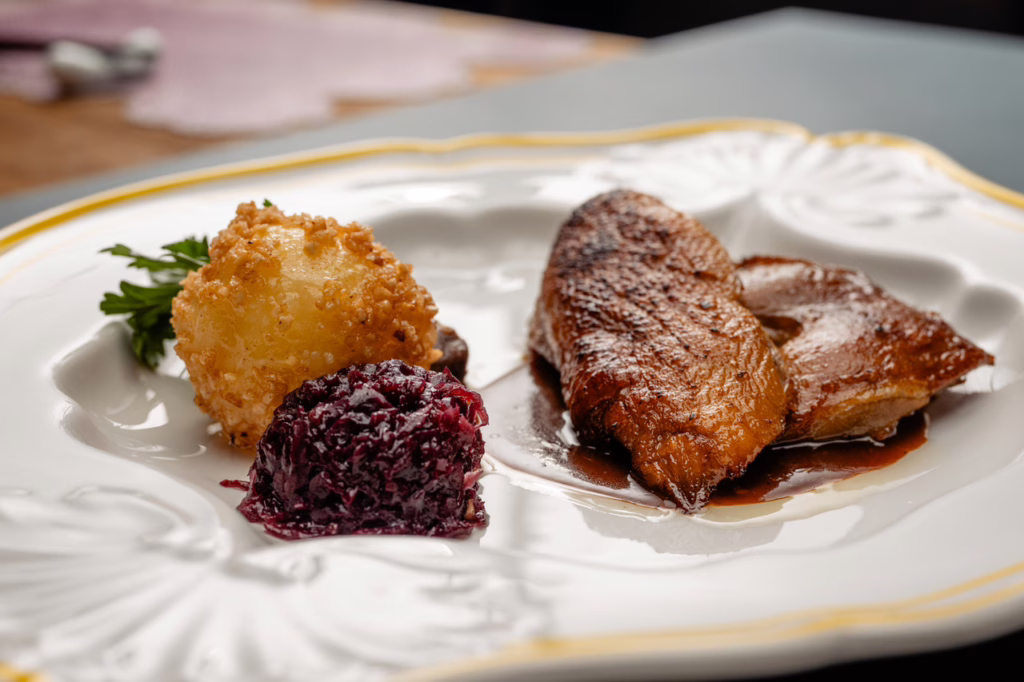 Das Menü beginnt mit einer Selleriesuppe, die mit Entenschinken und Nüssen verfeinert wird – ein Gericht, das Wärme und Komfort bieten soll. Als Hauptgang serviert Raue eine ofengegarte Ente mit geschmortem Rotkohl, Kartoffelknödeln und Majoran-Jus. Das Dessert ist ein moderner Bienenstich mit Maracuja-Säure. Das Menü, inklusive Weinbegleitung mit ausgewählten Weinen renommierter deutscher Güter wie Dreissigacker und Dautel, Wasser, Kaffee und Auffahrt auf den Turm, kostet pro Person 132,50 Euro. Reservierungen sind ab dem heutigen 24. Oktober online möglich: www.tv-turm.de/sphere-tim-raue.