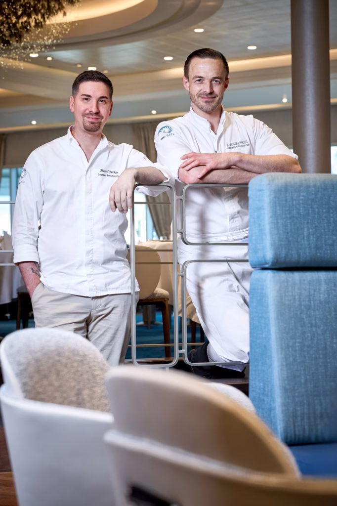 Die Corporate Executive Chefs Timon Lohrengel und Marcel Jücker verantworten die gastronomische Weiterentwicklung auf allen fünf Schiffen – den Luxusschiffen EUROPA und EUROPA 2 und den drei Expeditionsschiffen HANSEATIC nature, HANSEATIC inspiration und HANSEATIC spirit.