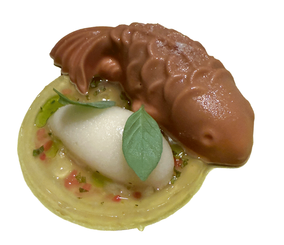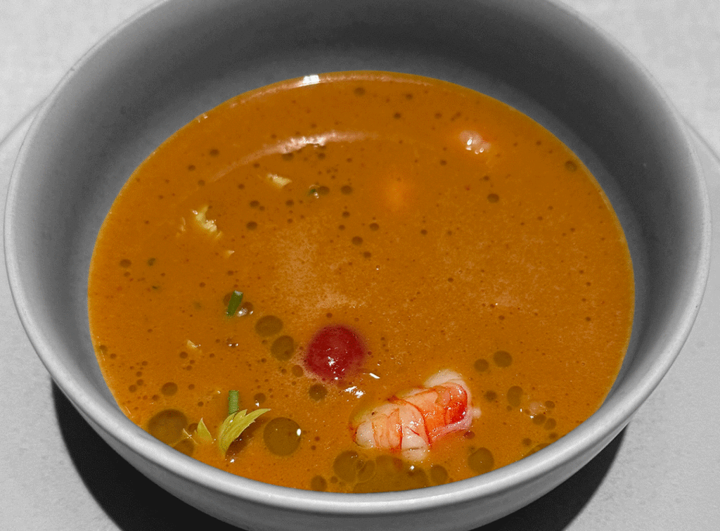 gebutterter Sud von Krustentieren, Orangenöl, Koriander und Korianderöl, gehackte reife Tomaten, Kapstachelbeere, Kalamansigel, gegrillte Mazara Garnele