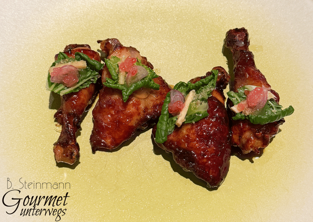 DieStubenkükenkeulen wurden mariniert und am Knochen gegart, frittiert und in Sirup aus Geflügelfond, Knoblauch, Chili und Rohrzucker glasiert. Dazu kamen Pak Choi mit Fingerlimes, Zitronengras und marinierte Schalotten, Gel von Dashi und Holunderblüte, Ingwer-Frühlingslauchpüree