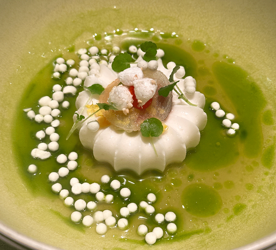 Grüner Currysud mit Ingwer und Kombucha, Schaummousse und geeiste Perlen von Kokosnuss. Baiser von Kokosnusspulver und geröstetem Reis und Salz, rote Chili, Kürbispüree, rotes Zwiebelpüree, Apfel, Öl von Kaffirlimette und Koriander