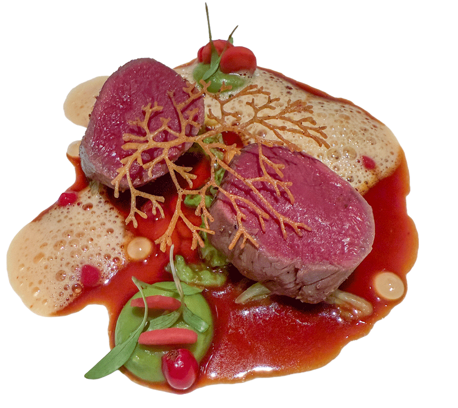 Vor uns liegt ein bleu gebratenes Rehfilet mit Jus und Knuspergebäck.  Öl mit grünem und rotem Sichuanpfeffer, Gelee, marinierte Kronsbeeren, Püree und sautierter Wirsing, Bergamottengelee sowie eine Entenleberrahmsauce fanden ebenfalls Verwendung.