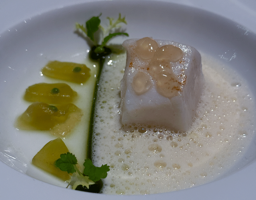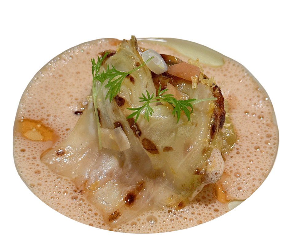 in Knoblauch sautierter Spitzkohl, gekochter Ingwer, marinierte Wasserkastanie, Sud von oxidiertem Riesling, Rahmsauce von Jakobsmuschelcorail, Quenelle von Jakobsmuschel mit Rindermark, Zitronenzeste, Nadelkoriander, Peperoniöl, Wurzelgemüsepüree