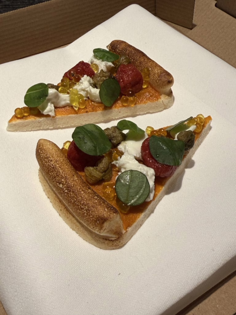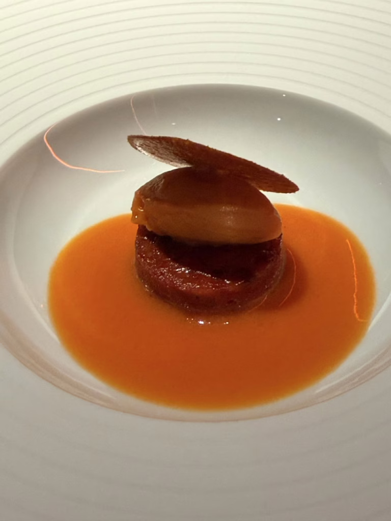 Die Küche startete mit zwei Grüßen aus der Küche. Zuerst gab es eine Baiser-Pizza. Das war recht interessant. So richtig gut war das zweite Amuse Geule: Paprika-Tatar mit Paprikaeis und Jalapeño-Jus. Das war für mich ein echter Wow Effekt, während meine Frau, die nicht so gerne Paprika mag, meine Begeisterung nicht teilte.