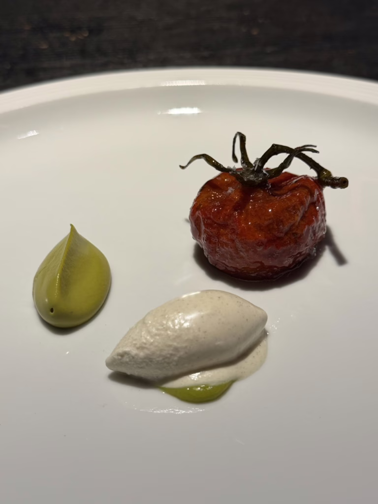 Das Dessert mit gefüllter Tomate mit sehr harter Schale, Pistazien- und Buttermilchcreme war jetzt nicht der große Hit. Mittlerweile waren wir auch satt und hatten seit langer Zeit mal wieder ein wirklich anständiges Menü gehabt, wo man nicht jammern brauchte, wie teuer es ist, sondern sich freuen konnte, große Kunst auf dem Teller gehabt zu haben!