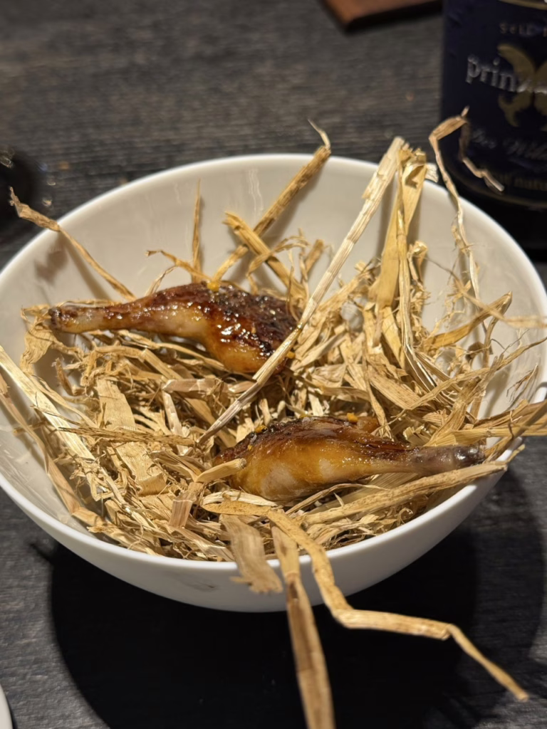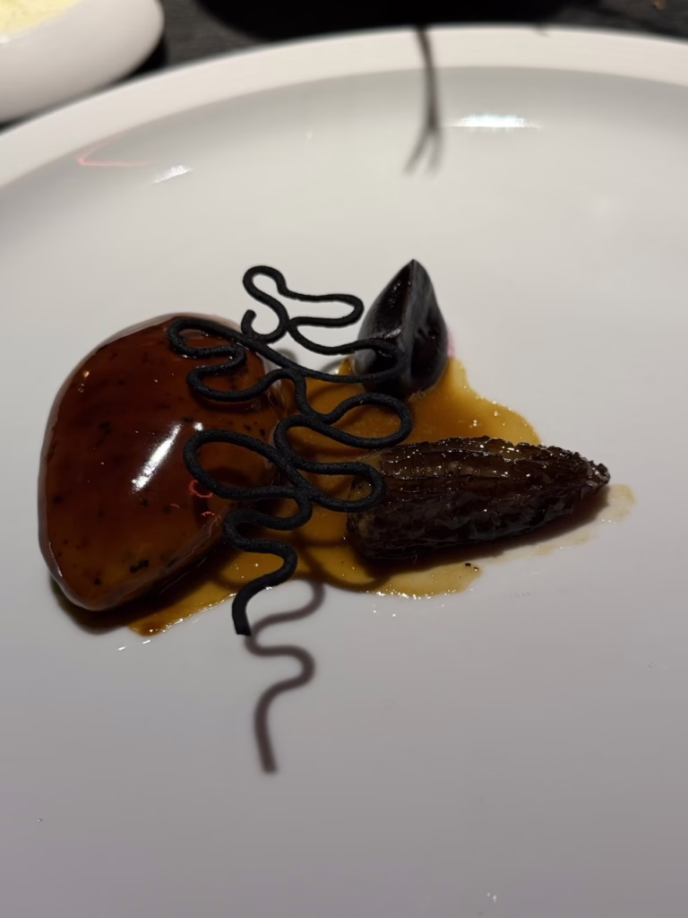 Nun kam der Fleischgang: Wachtel. Leider klein, wie so eine Wachtel halt ist, aber was für eine Komposition: Spitzmorchel und Blaubeere gab es dazu, Schmeckte hervorragend! Links auf dem linken Foto ist die Brust, die im Original viel besser aussieht.