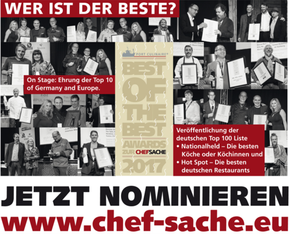Zum sechsten Mal schreibt das Team von Port Culinaire diesen Wettbewerb aus. Zugegeben: Auszeichnungen für gute Leistungen in der Branche werden fast schon inflationär verteilt. Die Awards anlässlich der CHEF-SACHE sind jedoch etwas Besonderes. Werden sie doch nicht von einer – wenngleich kompetenten aber überschaubaren – Fachjury weiterlesen ...
